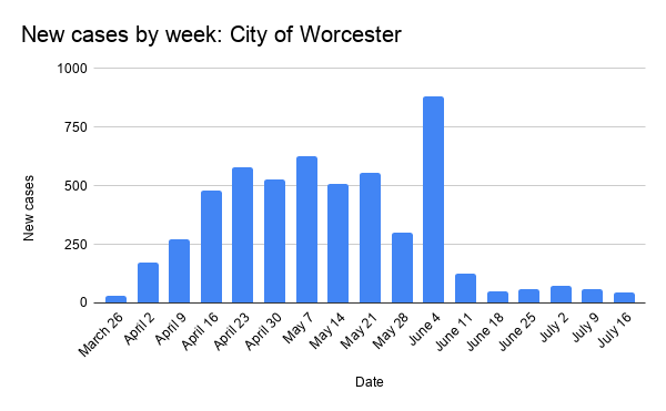 The City of Worcester reported 5,351 total coronavirus cases, which is a 43-case increase from the previous week.