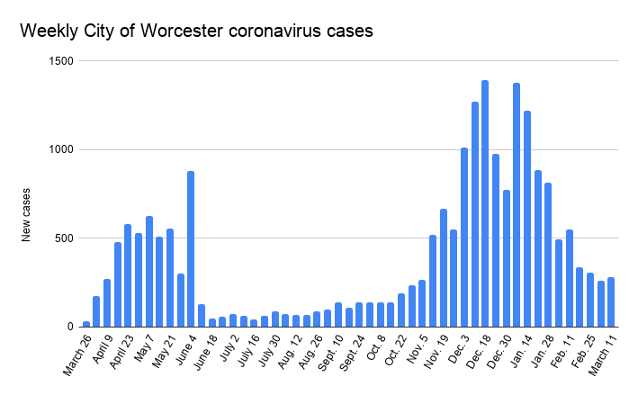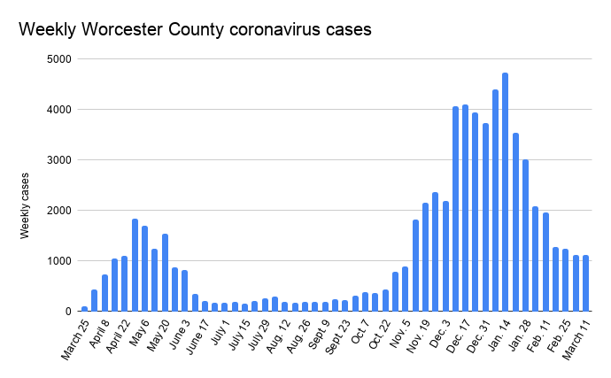 Worcester County cases rose by 1,115 in the past week to hit 67,082 since the pandemic began. In the city of Worcester, cases rose slightly from the prior week, with the case total growing by 283 to reach 21,075.