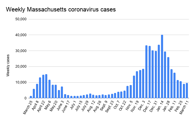 That plateauing of cases comes as business capacities, including those of restaurants, have been increased and as sports facilities are about two weeks away from being able to open to small crowds, and as known cases of new variants continue to spread in Massachusetts. The variant that began in the United Kingdom has accounted for 106 reported cases in Massachusetts through Tuesday, according to the U.S. Centers for Disease Control and Prevention.