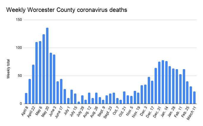 Worcester County had 22 new reported deaths to hit 2,077 since the pandemic began. Worcester had three new deaths for a new total of 413. Massachusetts had 251 new deaths to reach 16,218.