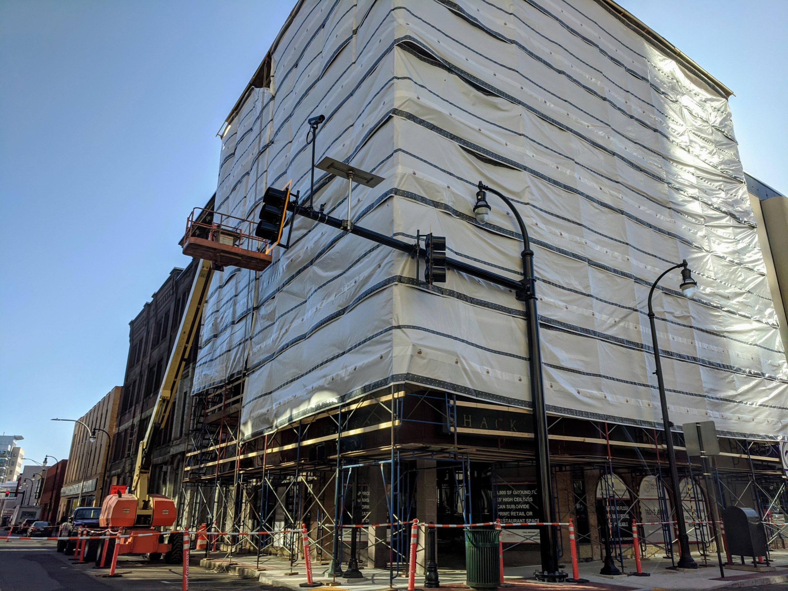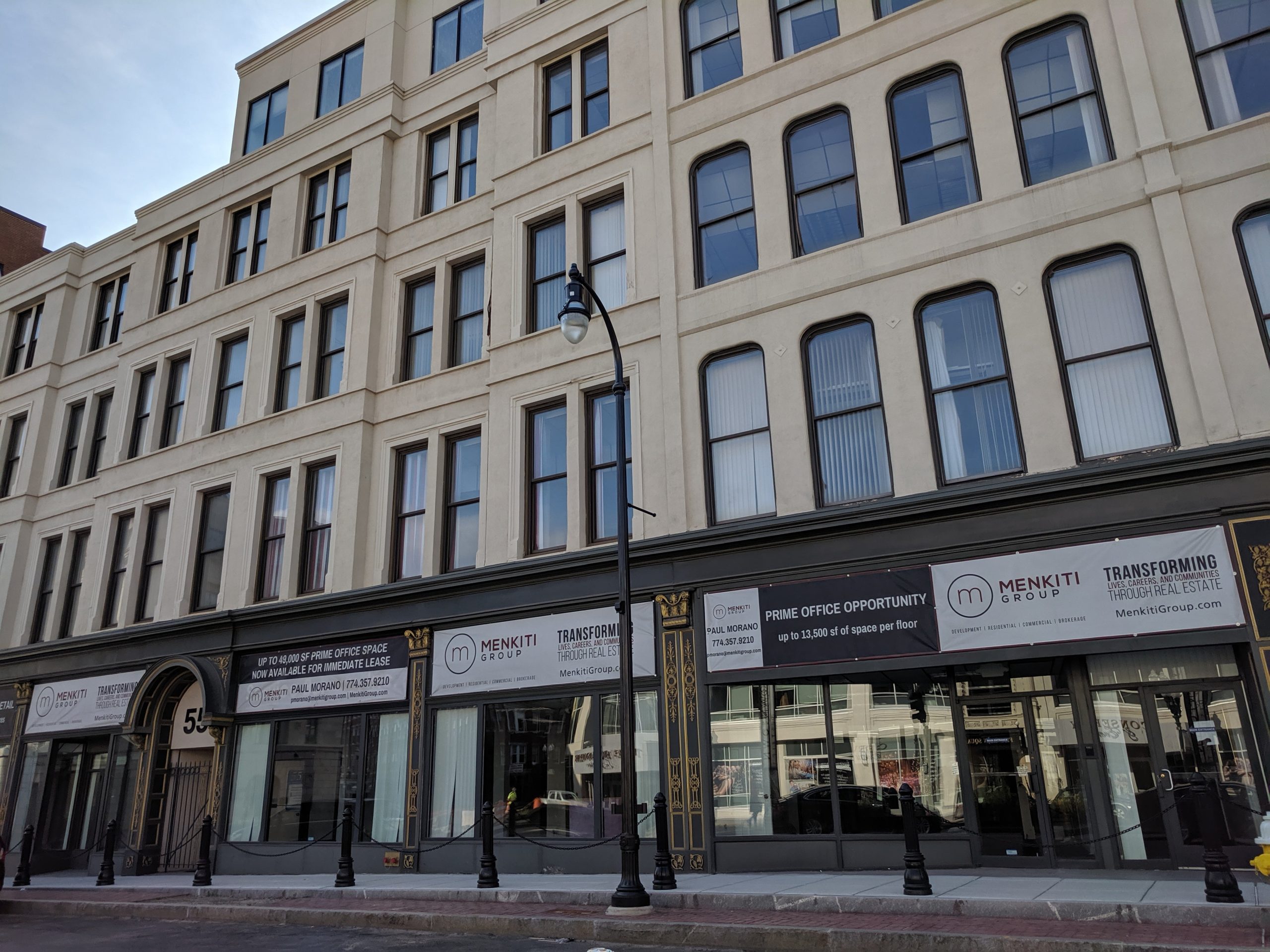 Another Menkiti property, a four-story building at 201 Main St. across from the Worcester County Superior Court, had a covering masking a gray stone exterior. That has also been removed, with Menkiti joking about the firm buying buildings with ugly facades. The building is envisioned for first-floor retail and upper-floor offices.
