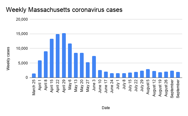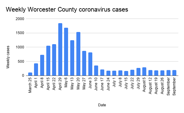The City of Worcester didn’t provide its weekly coronavirus case numbers on Thursday. Last week, it reported 98 new coronavirus cases, its highest number since early June.