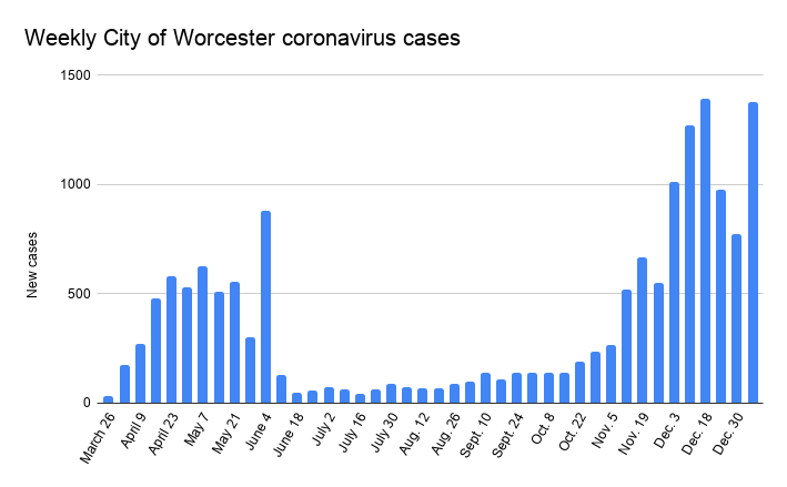 Worcester’s case count has risen to 15,910, city officials reported Thursday. The rise of 1,376 cases is among the city’s highest, but it reflects an eight-day period, a day longer than normal because officials gave weekly data a day earlier last week because of New Year’s Eve.