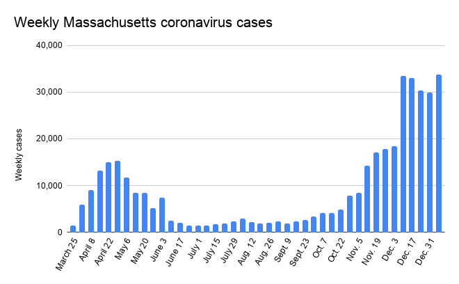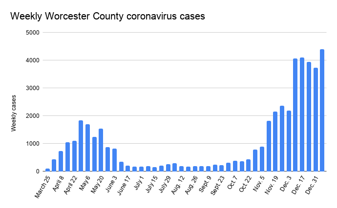 In Worcester County, 4,398 new cases were reported in the past week, beating the previous high of 4,097 just a few weeks ago, according to state data. The county also had 78 newly reported deaths, its highest since the weekly total through June 3. Worcester County now has 46,398 cases and 1,601 confirmed and probable deaths since the pandemic began. The state has had 12,634 deaths, including 71 on Thursday alone.