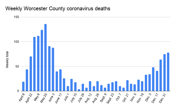 Deaths are on the rise everywhere — in the city of Worcester, Worcester County and statewide — as public officials continue to warn of a post-holidays spike in cases. Deaths typically trail cases by a few weeks, and cases in Massachusetts generally plateaued in early December and have remained at around the highest levels the state has seen since the pandemic began.